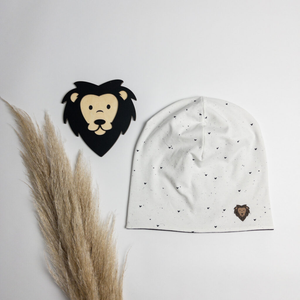 Der Oberstoff des Beanies ist aus Bio Jersey mit Herzchen auf Cremeweiß. Der Innenstoff, ebenfalls aus Jersey, ist Schwarz.