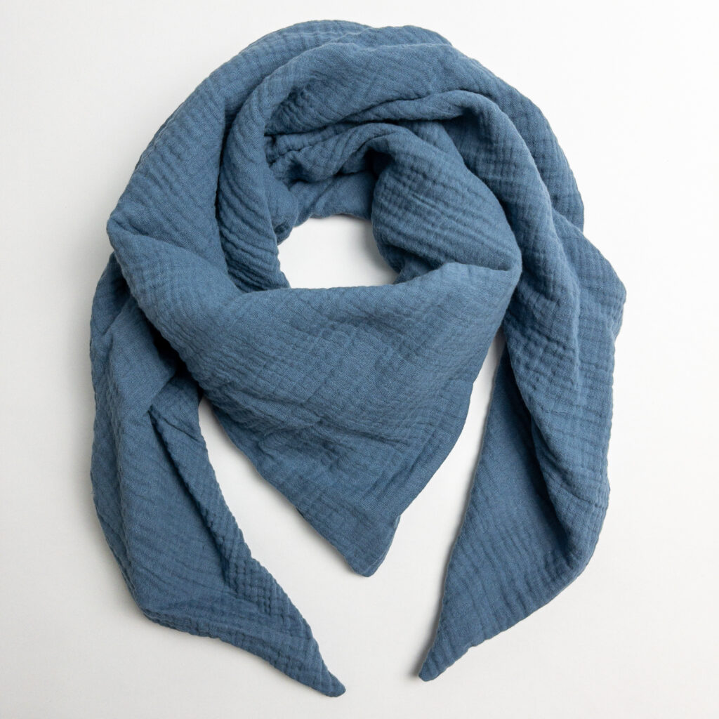 Der Schal ist ein Dreieckstuch, besteht aus Musselin in Smoky Jeansblau und hat eine Größe von ca. 140x60cm (Kinder) oder ca. 100x43cm (Kleinkinder).