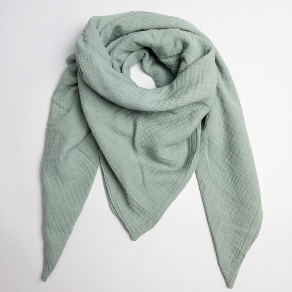Der Schal ist ein Dreieckstuch, besteht aus Musselin in Altmint und hat eine Größe von ca. 140x60cm (Kinder) oder ca. 100x43cm (Kleinkinder).