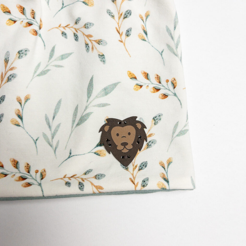 Der Oberstoff des Beanies ist aus Jersey mit Weidenkätzchen auf Cremeweiß. Der Innenstoff, ebenfalls aus Jersey, ist Altmint.