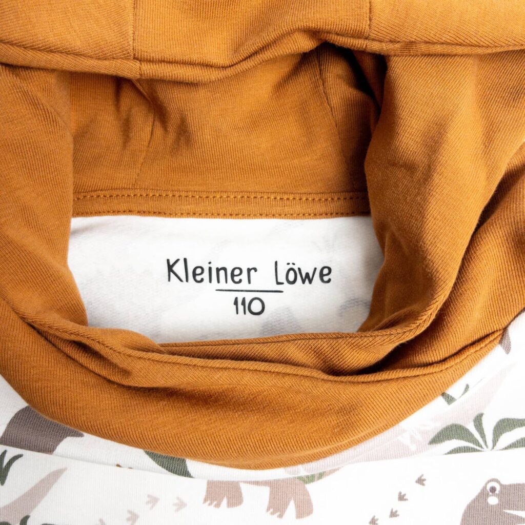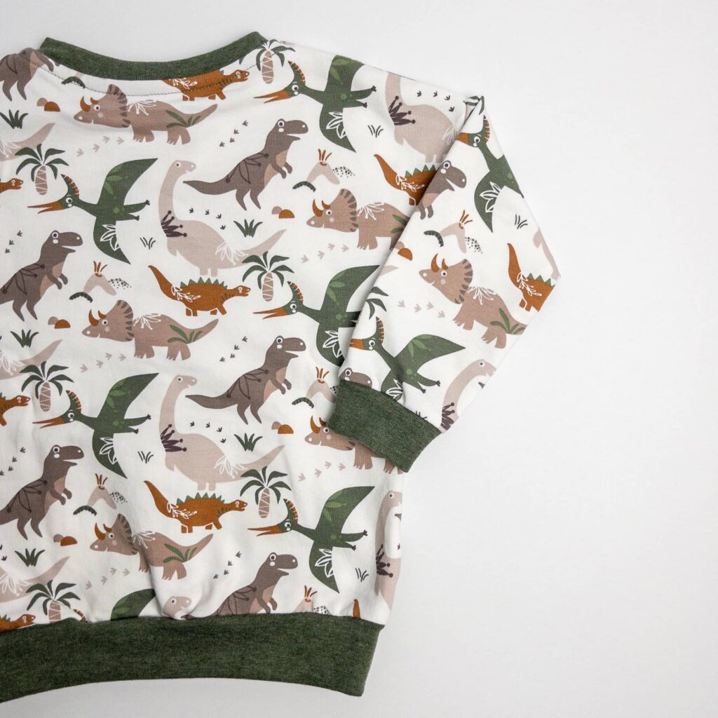 Dieser schöne Pullover ist locker geschnitten und wahlweise mit oder ohne Kapuze bestellbar. Der Hauptteil besteht aus einem French Terry mit Dino Muster auf Warmweiß und die Kängurutasche, sowie die Kapuze, aus einem French Terry wahlweise in Zimt, oder Khaki.