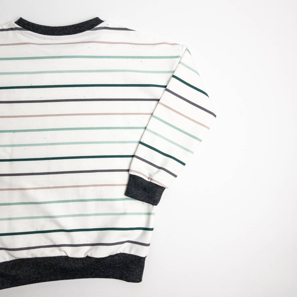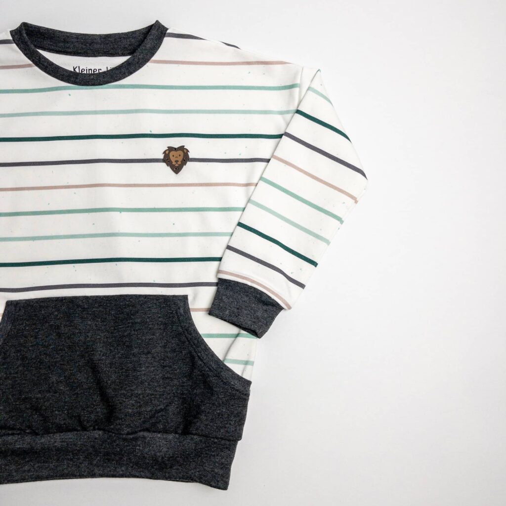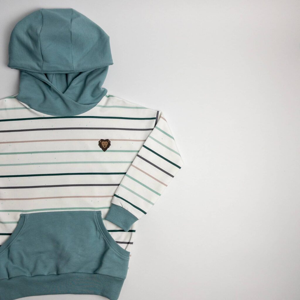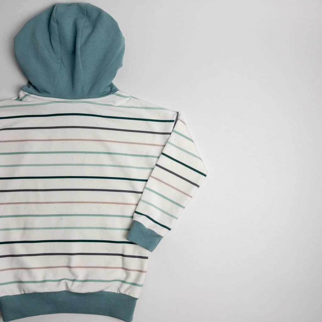 Dieser schöne Pullover ist locker geschnitten und wahlweise mit oder ohne Kapuze bestellbar. Der Hauptteil besteht aus einem Bio French Terry mit Streifen in verschiedenen Mint-Grau-Tönen und die Kängurutasche, sowie die Kapuze, aus einem French Terry wahlweise in Anthrazit, oder dunklem Altmint.